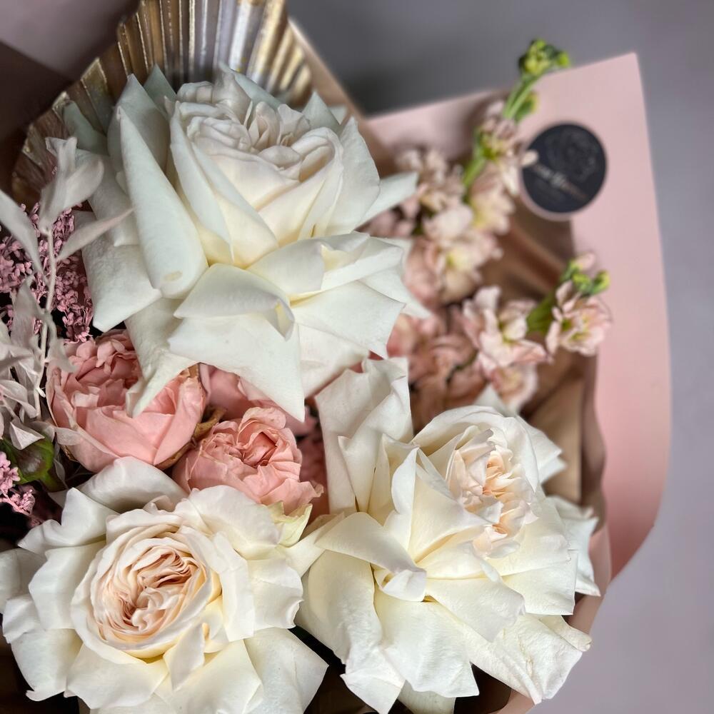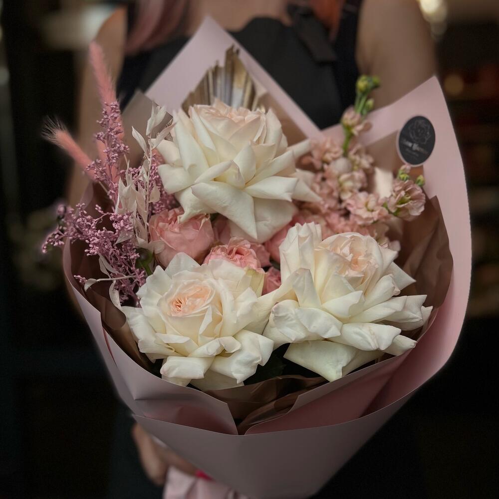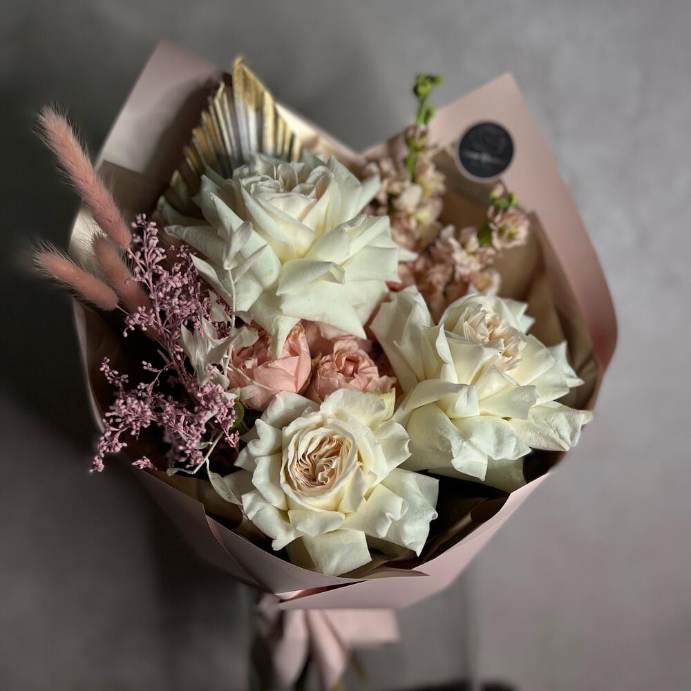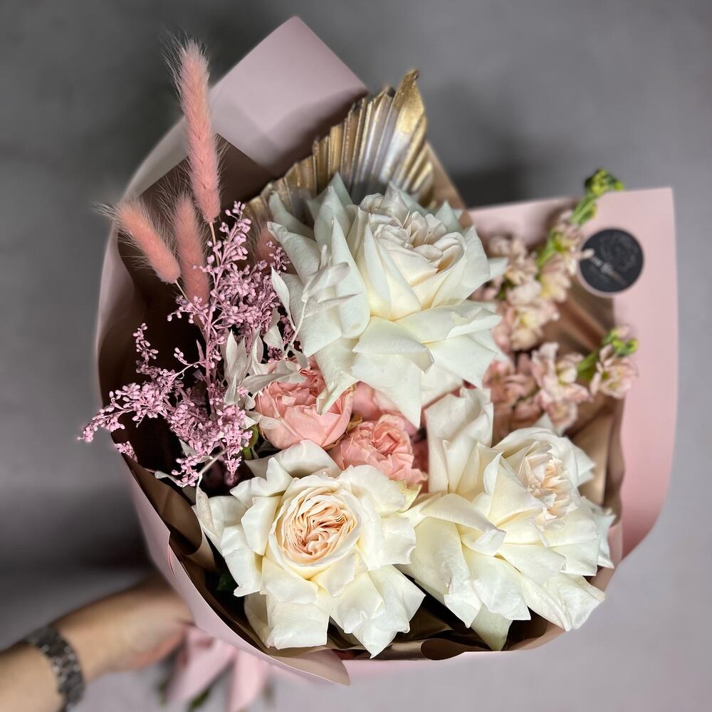Пионовидная роза – 3 шт.Маттиола – 2 шт.Кустовая пионовидная роза – 1 шт.Перо – 1 шт.Лагурус – 4 шт.Рускус – 1 шт.Сухоцветы – 2 шт.декоративная упаковка – 1 шт.Атласная лента – 1 шт.