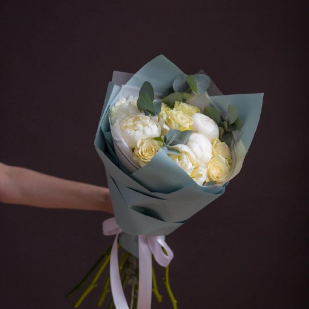Тишью – 1 шт.Атласная лента – 2 шт.Корейская пленка – 2 шт.эвкалипт cinerea – 4 шт.пион duchess de nemours – 5 шт.кенийская белая роза 50 см – 6 шт.