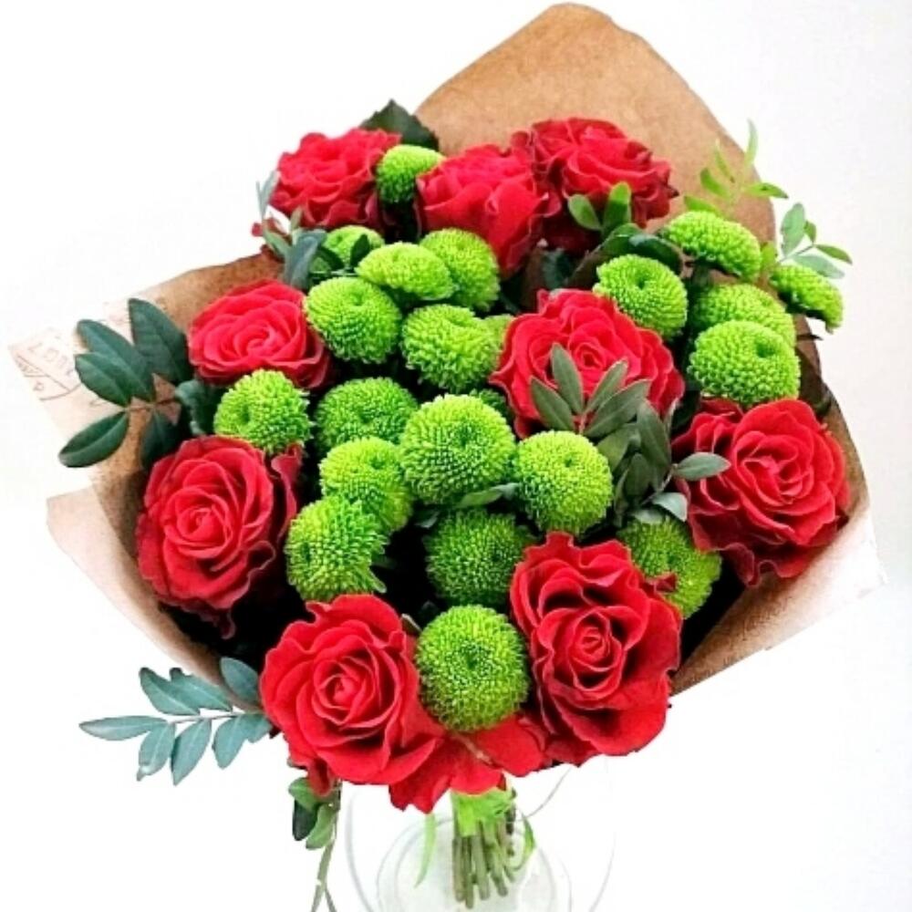 Небольшой букетик из красных розочек и бубочек зелёной хризантемы.