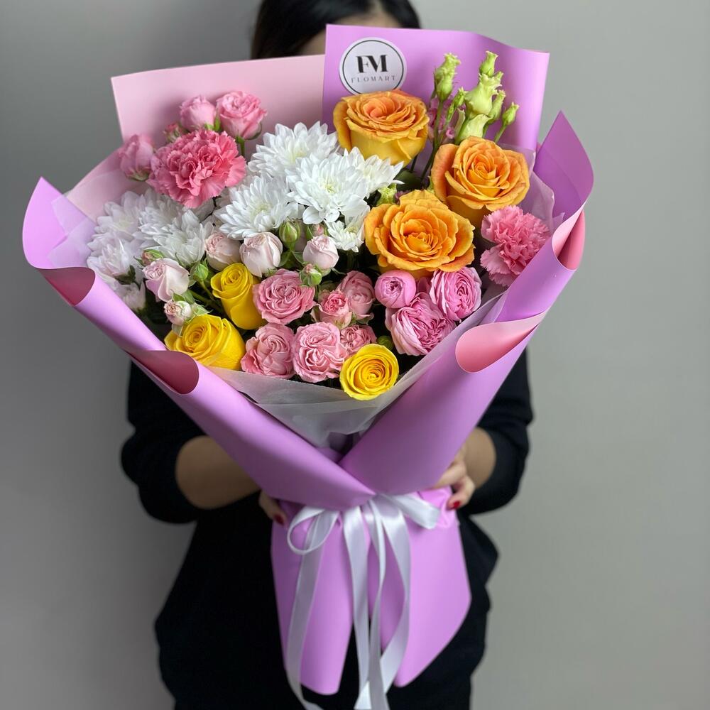 Эустома – 1 шт. Кустовая роза – 4 шт. Гвоздика – 2 шт. Роза – 6 шт. Хризантема кустовая – 2 шт. Упаковка – 1 шт.