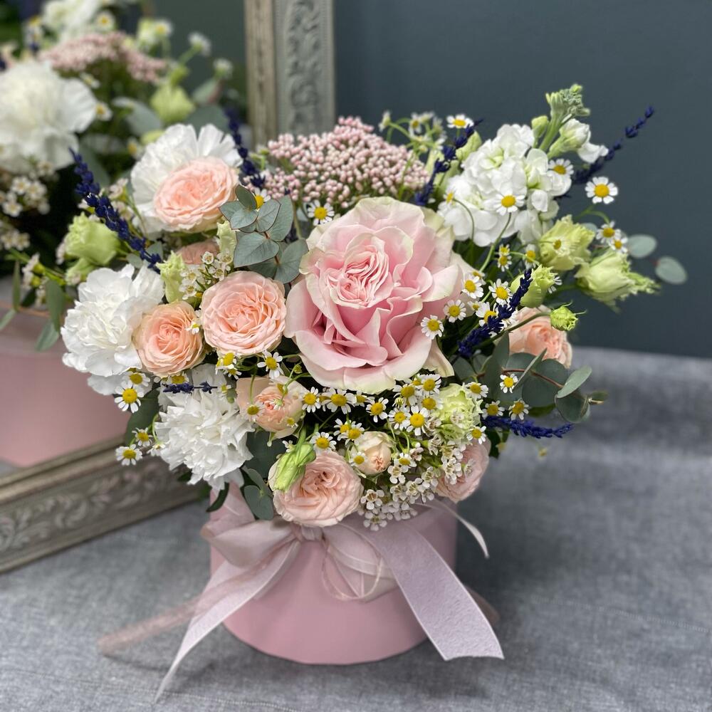 Цветочная композиция в шляпной коробке L «Утро в саду»