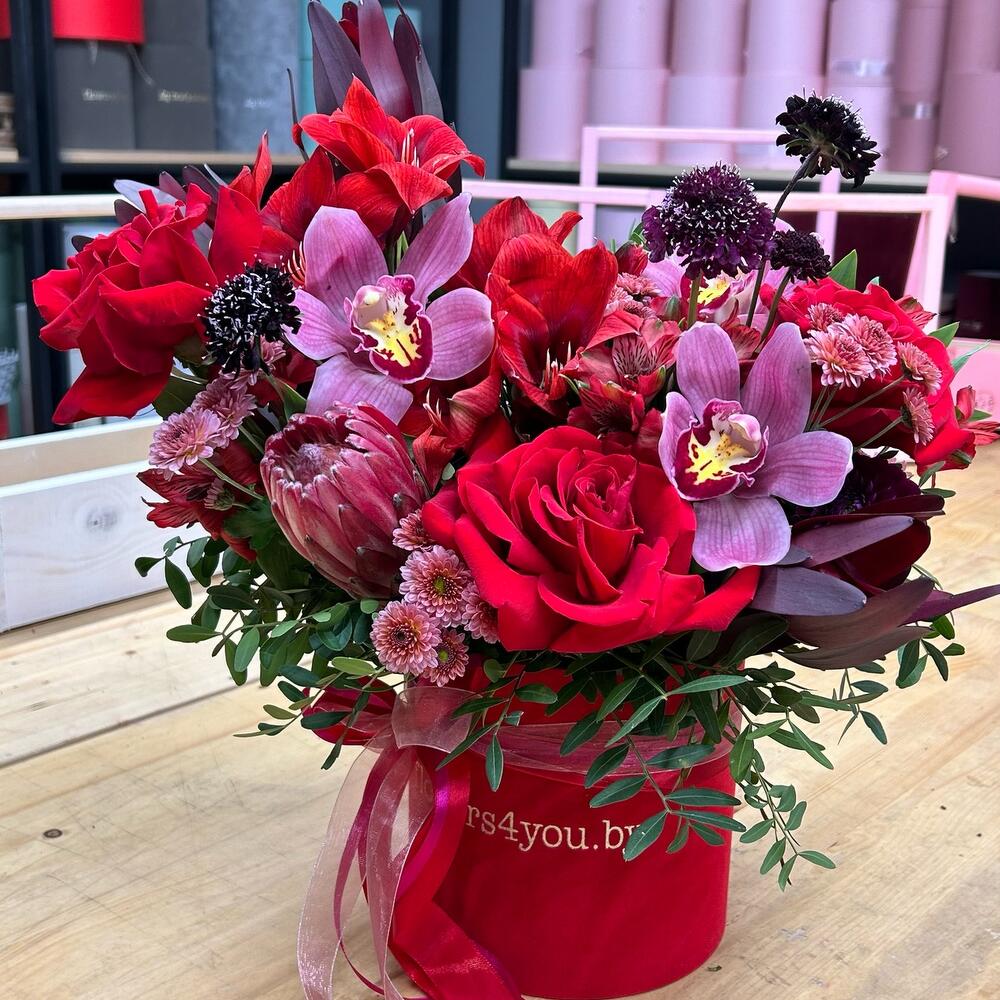 Страстная Алая коробка только для самых искушенных, ценящих роскошь и эстетику людей. Очень экстравагантная с экзотическим цветами, абсолютно не банальная композиция. Производит «вау» впечатление с первого взгляда !