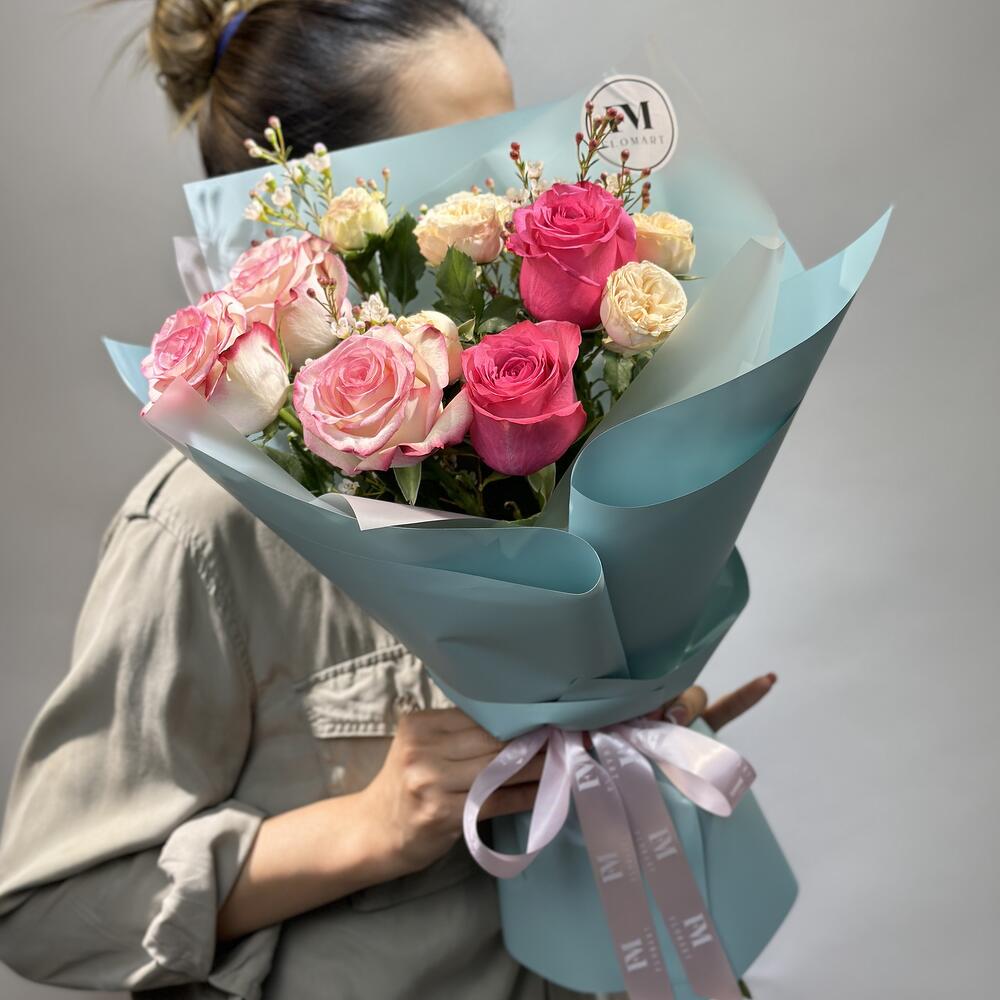 Упаковка – 1 шт. Роза Голландская – 5 шт. Хамелациум – 1 шт. Кустовая пионовидная роза – 1 шт.