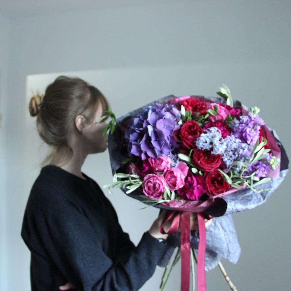 Маттиола – 4 шт.Роза пионовидная – 7 шт.Роза пионовидная кустовая – 3 шт.Гвоздика – 5 шт.Олива – 5 шт.Гортензия – 1 шт.Упаковка – 1 шт.