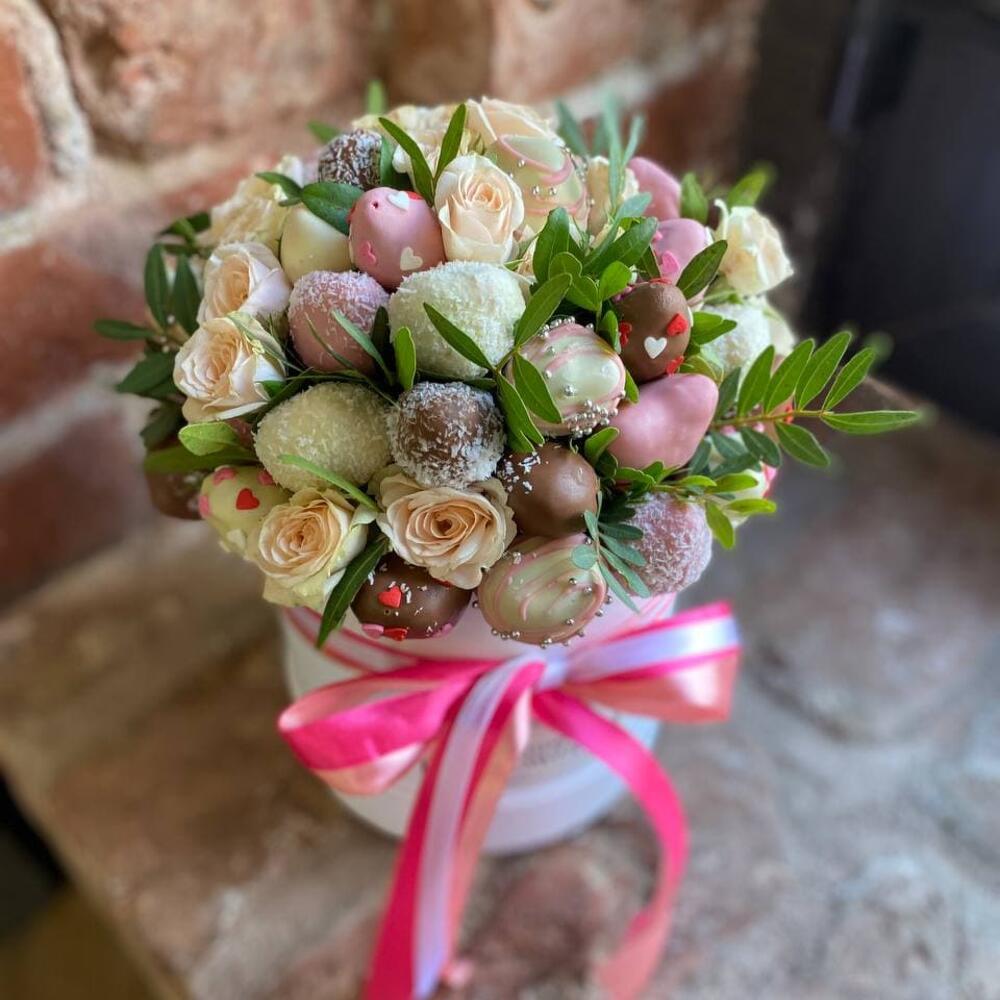 Композиция из клубники в шоколаде, мяты и кустовых роз "Эвредика"
