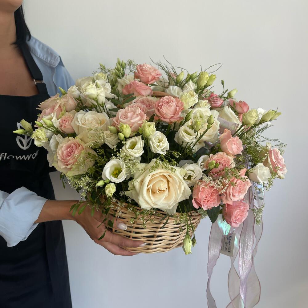 Корзина розами и эустомой