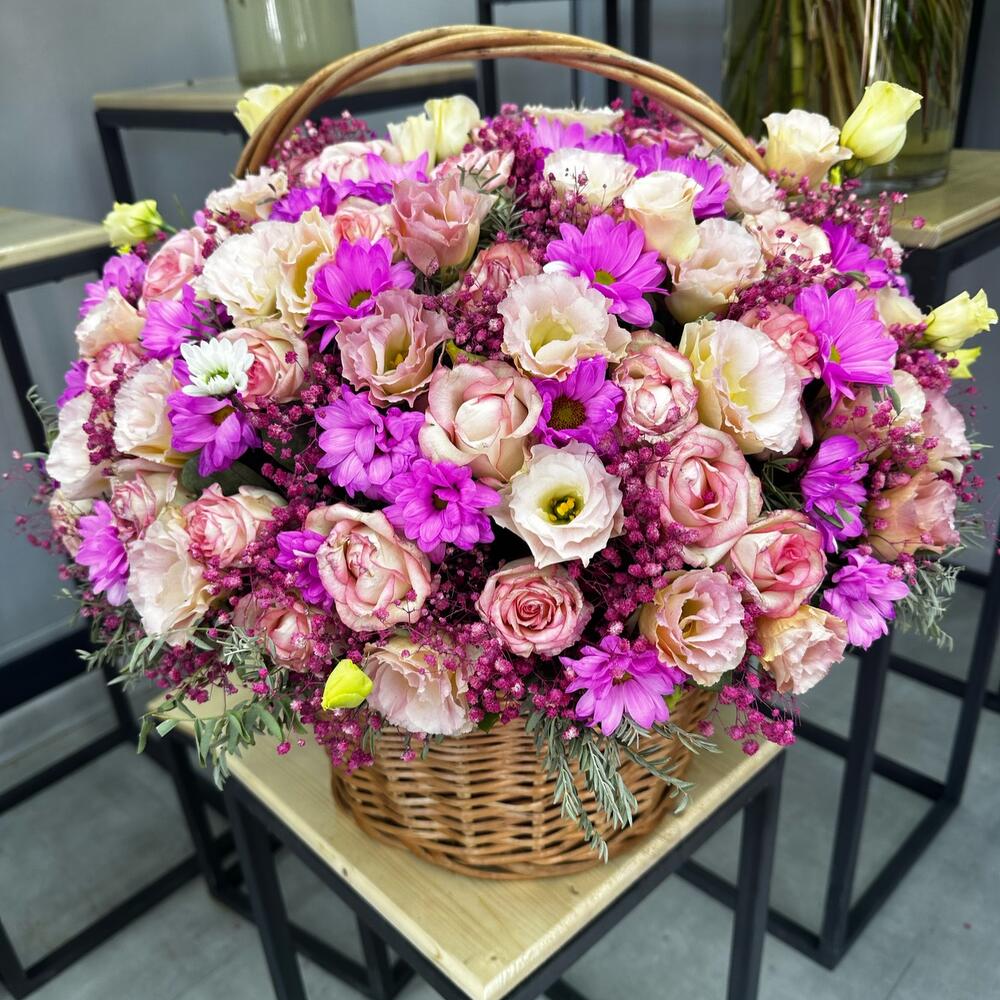 Роза – 29 шт. Хризантема – 33 шт. эустомы – 11 шт. зелень декоративная – 5 шт. Корзина плетеная – 1 шт.