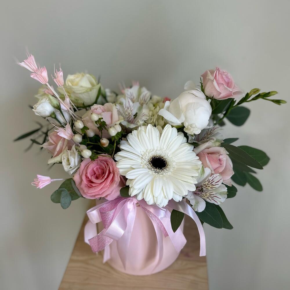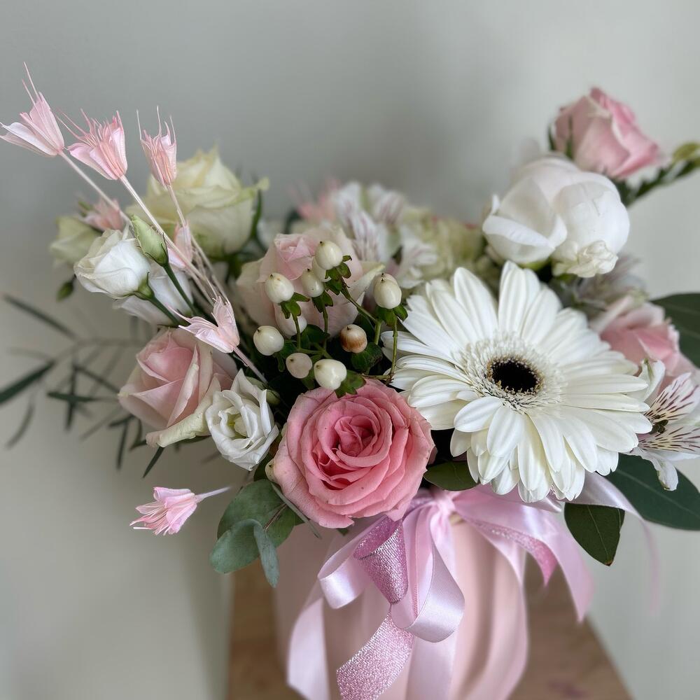Гербера – 1 шт.Пион – 1 шт.Роза – 5 шт.альтстомерия – 2 шт.Эвкалипт – 1 шт.Гиперикум – 1 шт.Сухоцвет – 2 шт.Коробка шляпная – 1 шт.Оазис флористический – 1 шт.