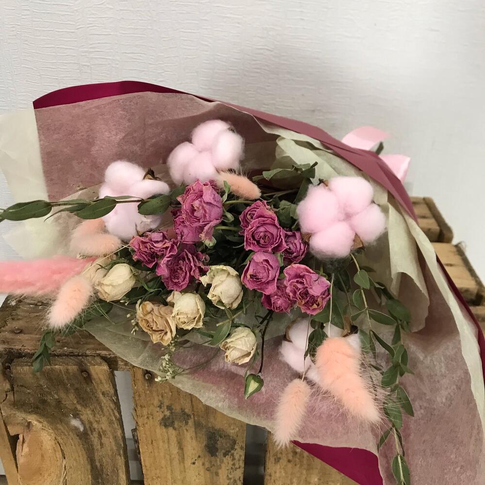 Лимониум – 1 шт.Хлопок – 4 шт.Кустовая роза – 3 шт.Лента атласная – 1 шт.Тишью – 1 шт.Упаковка дизайнерская – 2 шт.Лагурус – 6 шт.пампасная трава – 1 шт.