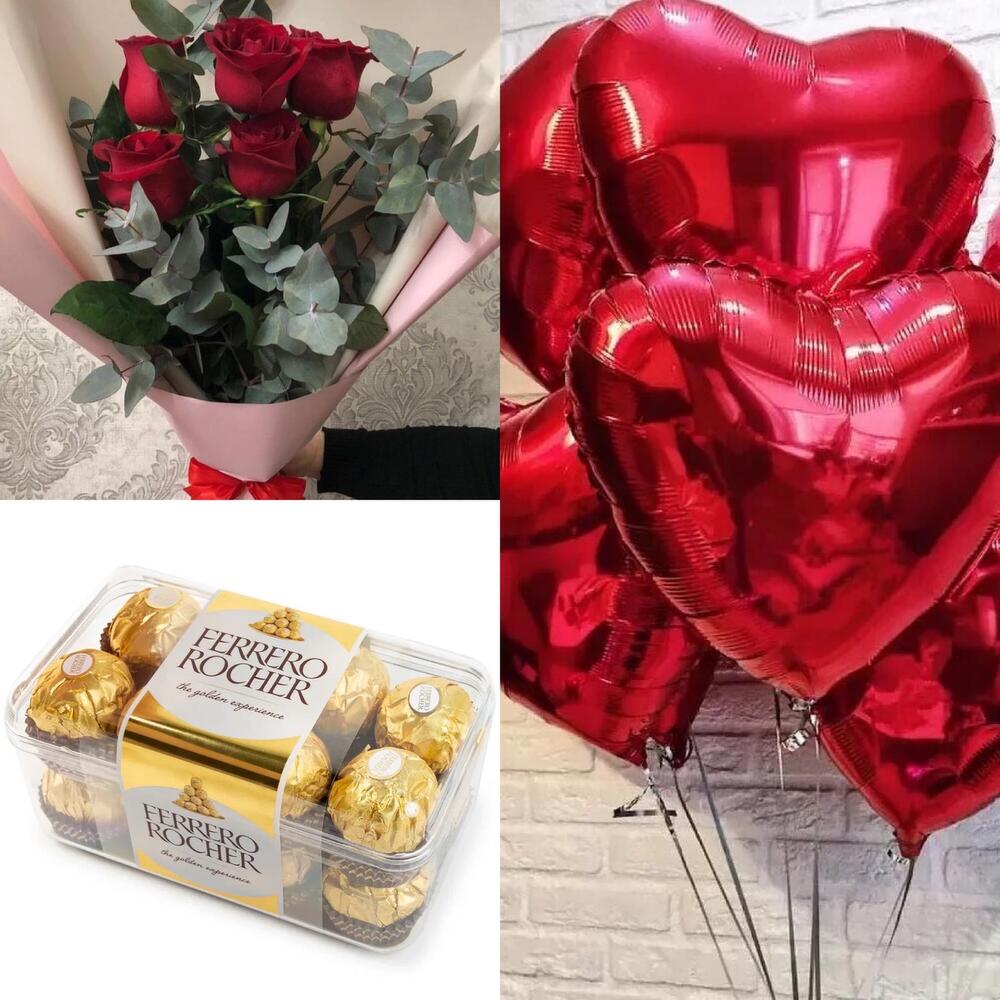 ферреро роше – 200 гр. Шары гелиевые – 7 шт. розы красные – 5 шт.