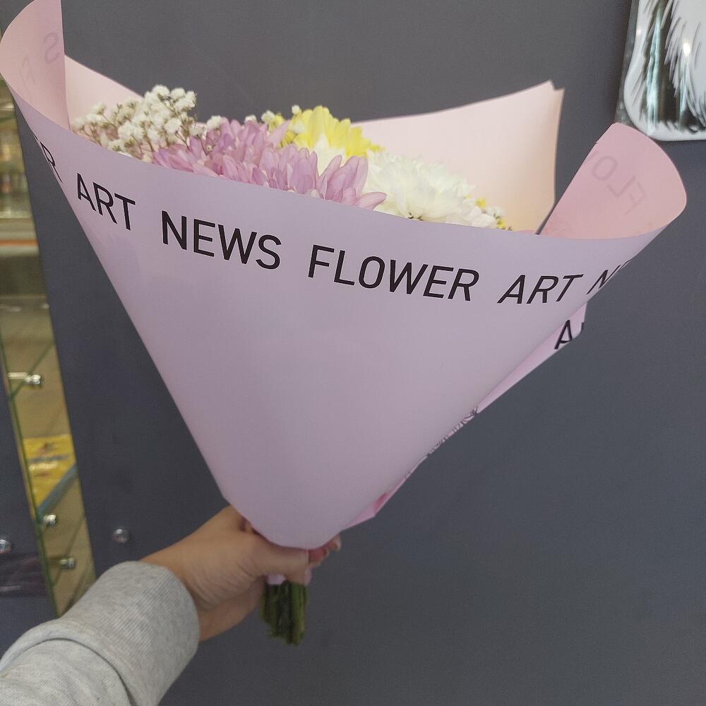 Хризантема кустовая – 3 шт.Роза Кенийская – 3 шт.Гипсофила – 3 шт.Упаковка дизайнерская – 2 шт.Лента атласная – 1 шт.