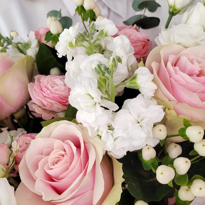 Нежный букет с розовой розой, белой эустомой и ягодами