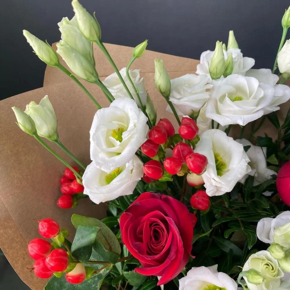 Роза Эквадор – 5 шт.Эустома – 3 шт.Гиперикум – 1 шт.Фисташка – 3 шт.Упаковка дизайнерская – 1 шт.Лента атласная – 1 шт.