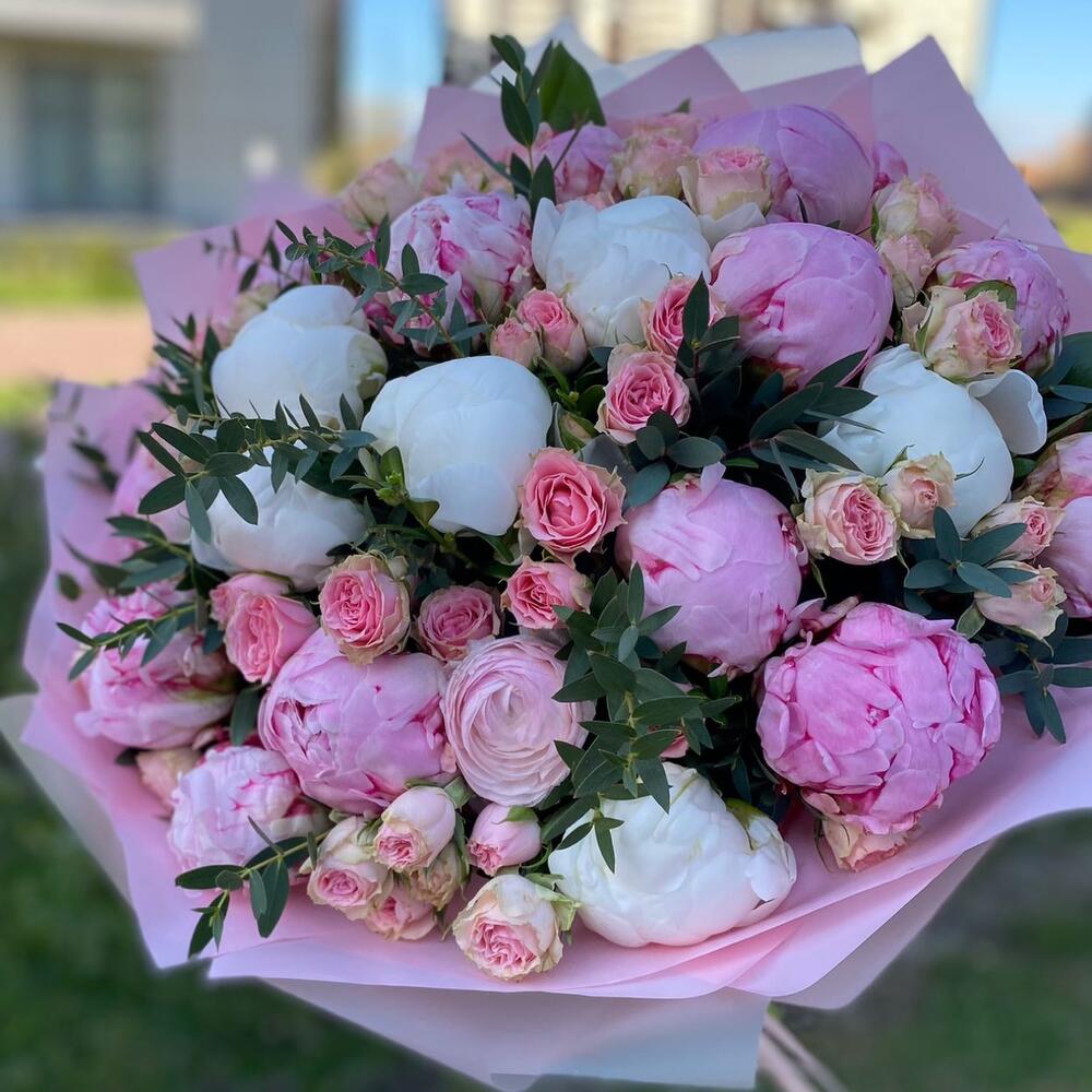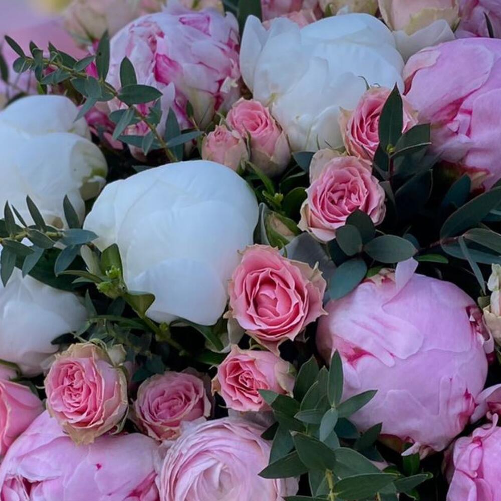 Пион – 15 шт.Роза кустовая – 9 шт.Эвкалипт – 5 шт.Упаковка дизайнерская – 5 шт.