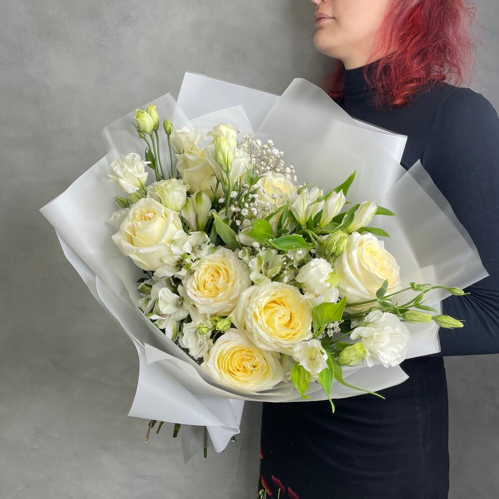 Альстромерии, Гортензии, Кустовые розы, Лизиантусы, Розы, Хризантемы