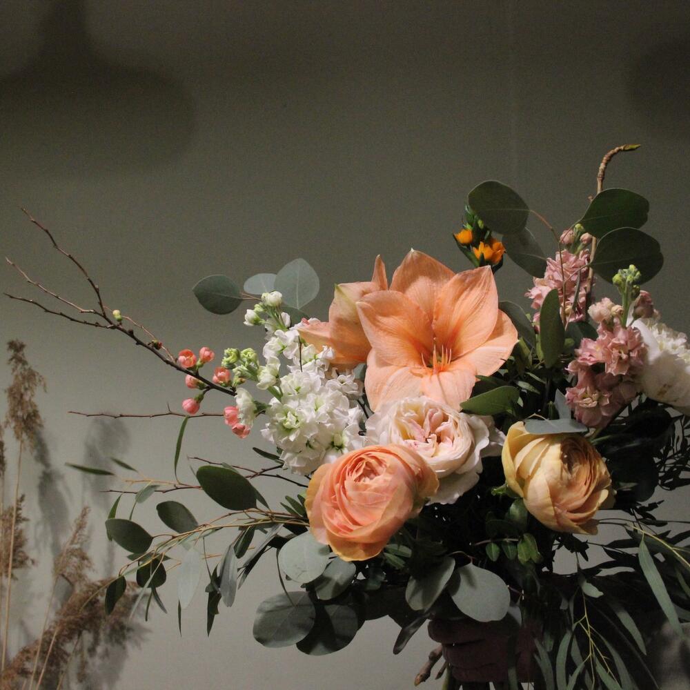 Амариллис – 1 шт.Орнитогалум – 1 шт.Маттиола – 6 шт.Пион – 1 шт.Ранункулюс – 2 шт.Роза пионовидная – 1 шт.Эвкалипт – 5 шт.ветки тополя – 1 шт.