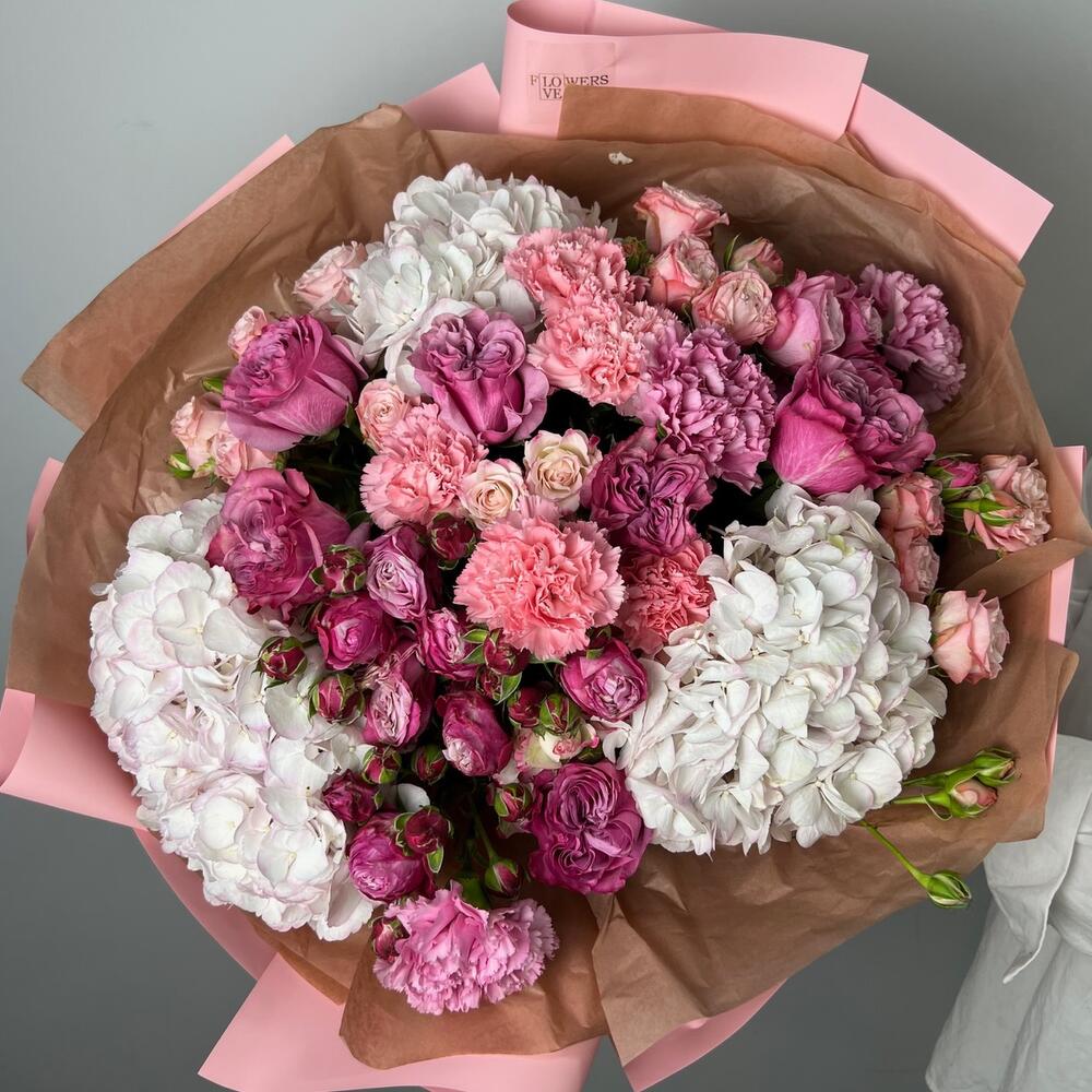 Альстромерии, Гортензии, Кустовые розы, Лизиантусы, Розы, Хризантемы
