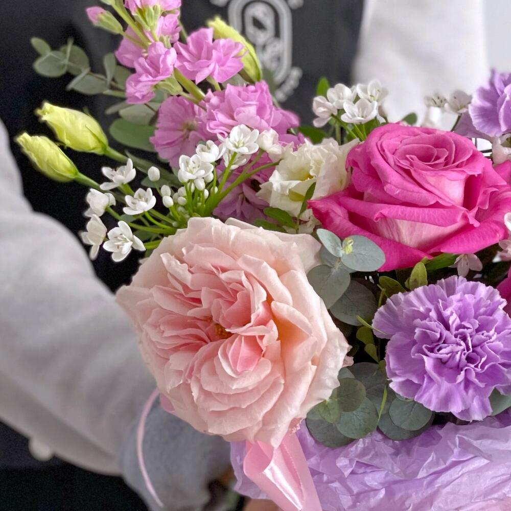 пион роза – 1 шт.Роза Эквадор – 2 шт.фиолетовая гвоздика – 3 шт.Маттиола – 1 шт.Лизиантус – 1 шт.Аллиум – 3 шт.Фисташка – 1 шт.Эвкалипт – 1 шт.Шляпная коробка – 1 шт.