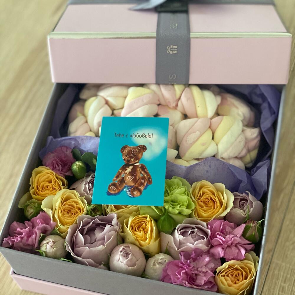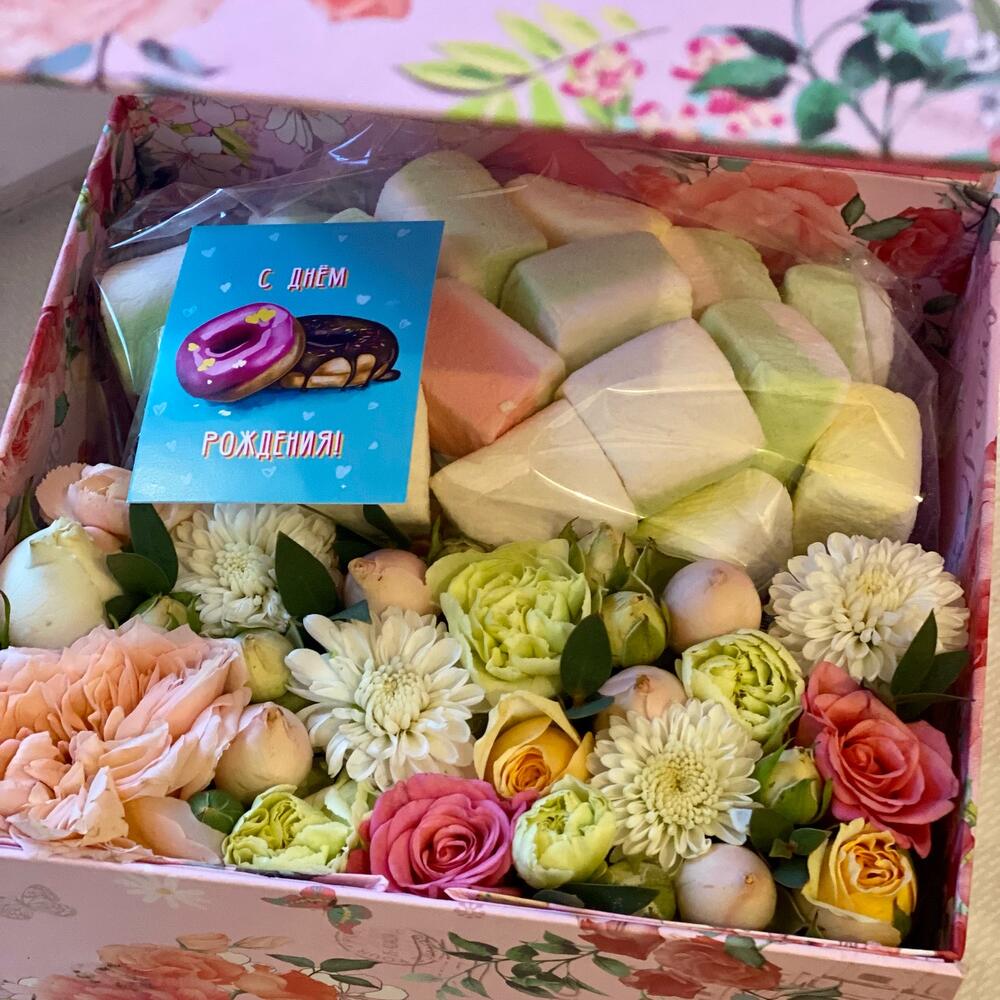Сладкая коробка с цветами и маршмеллоу