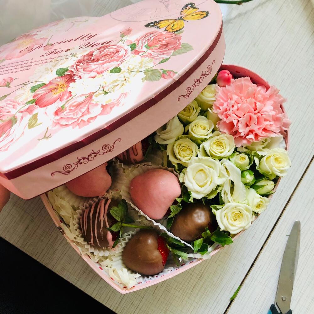 “Сладкое сердце ” – цветочная композиция с сладостями в коробке “Сердце”