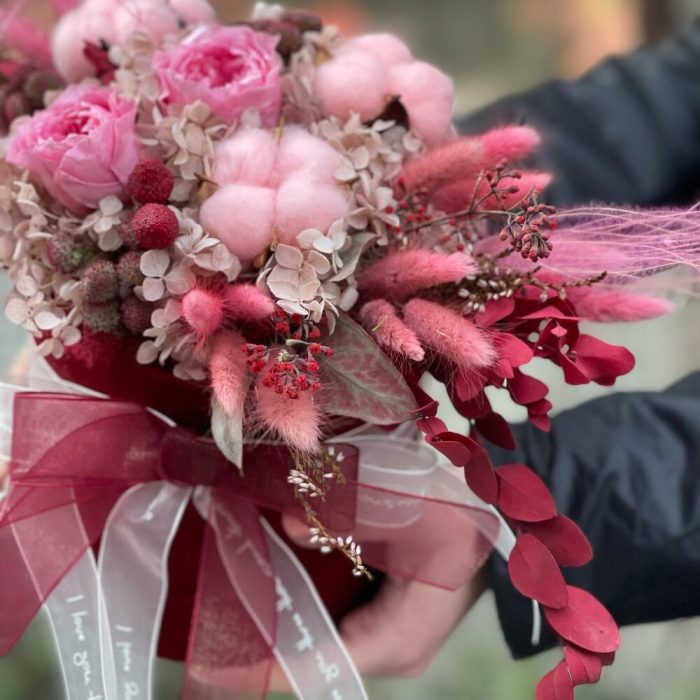 Коробка шляпная бархатная – 1 шт.Роза стабилизированная – 2 шт.Хлопок – 3 шт.гортензия стабилизированная – 1 шт.Лагурус (сухоцвет) – 25 шт.Эвкалипт стабилизированный – 4 шт.Ковыль – 8 шт.Мох стабилизированный – 10 шт.Бруния – 2 шт.Оазис флористический – 1 шт.цветы микс – 15 шт.Лента атласная – 2 шт.