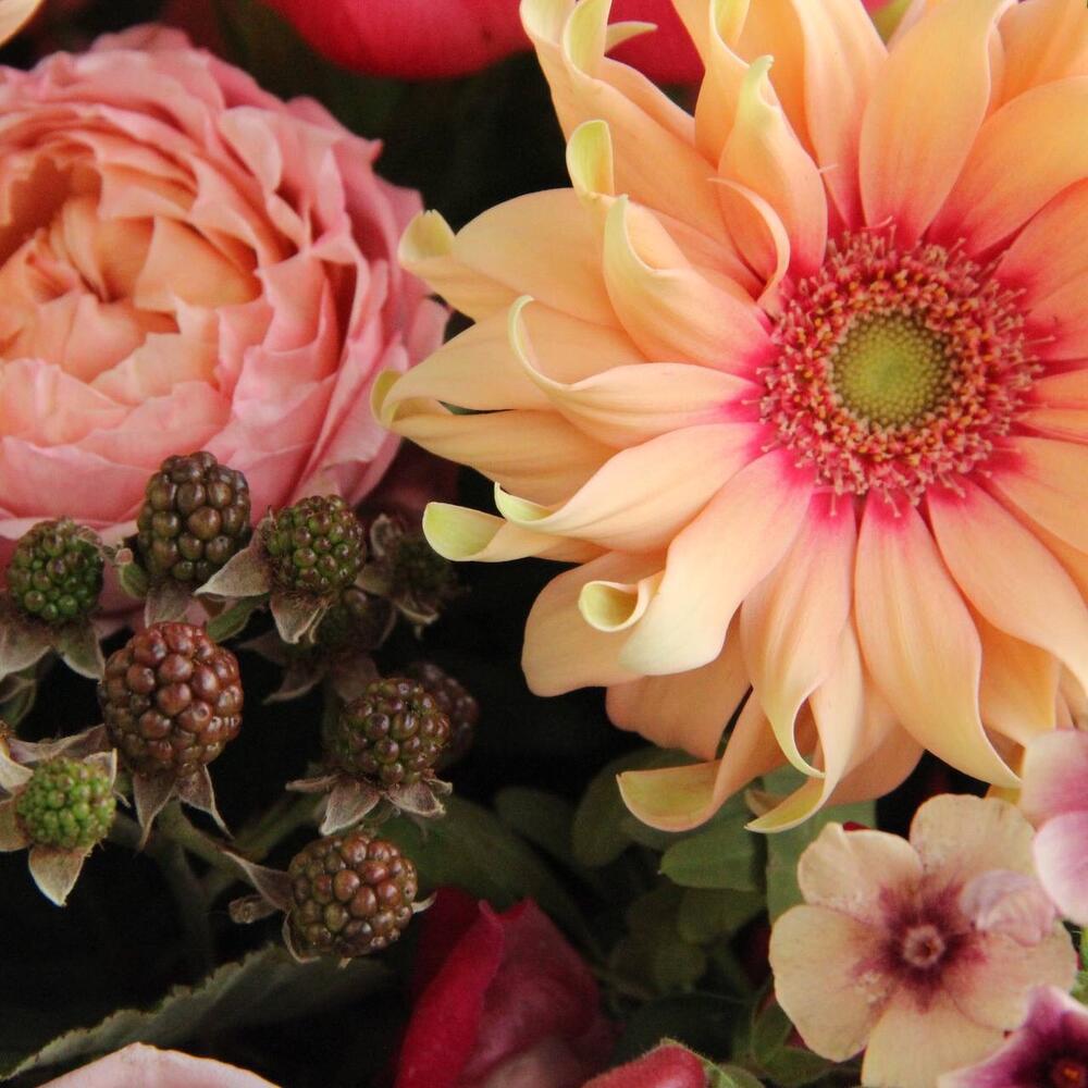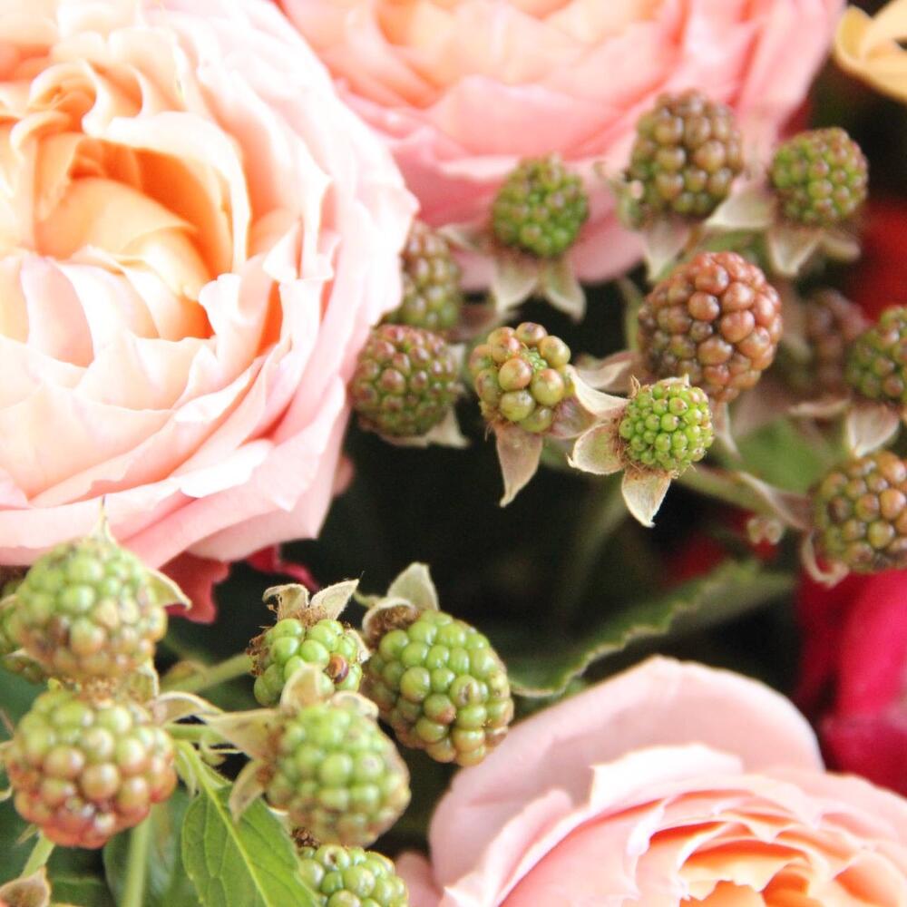 Авторский букет с ежевикой, пионами, душистой маттиолой, флоксами, львиным зевом, садовыми розами, кучерявыми герберами, ветками малины и травами.