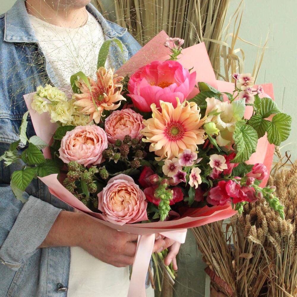 Пион – 1 шт.гербера кучерявая – 2 шт.Флокс – 2 шт.Львиный зев – 2 шт.Роза пионовидная – 1 шт.Ежевика – 1 шт.Маттиола – 1 шт.Лизиантус – 1 шт.Паникум – 1 шт.Ветки малины – 2 шт.Фисташка – 3 шт.Упаковка – 1 шт.Лента – 1 шт.