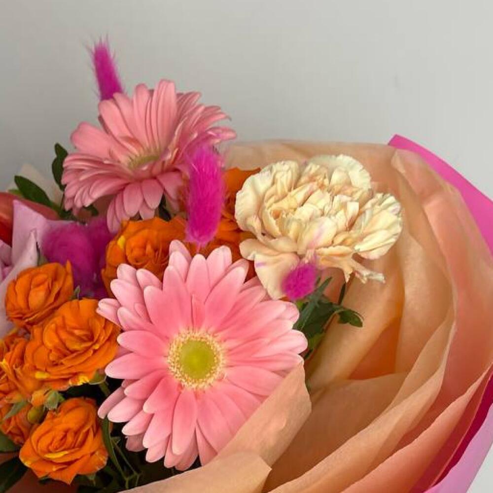 Яркий букет из гербер и кустовых роз в дизайнерском оформлении