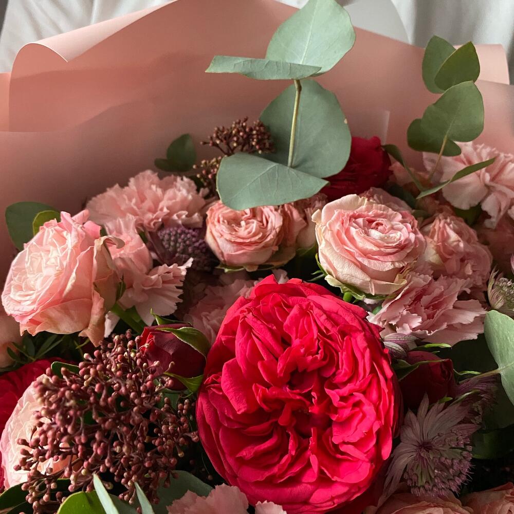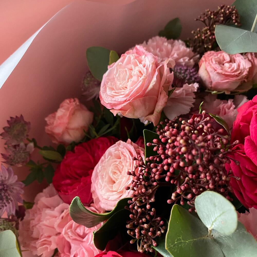 Роза пионовидная – 6 шт.Роза пионовидная кустовая – 7 шт.Астранция Биллион Стар – 5 шт.Скиммия – 4 шт.Диантус – 9 шт.Эвкалипт – 4 шт.Фисташка – 3 шт.Матовая пленка – 7 шт.Лента атласная – 1 шт.