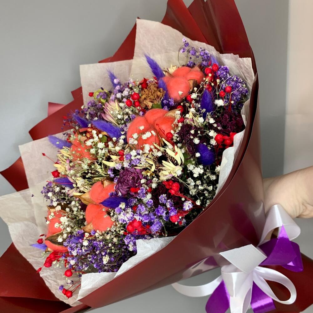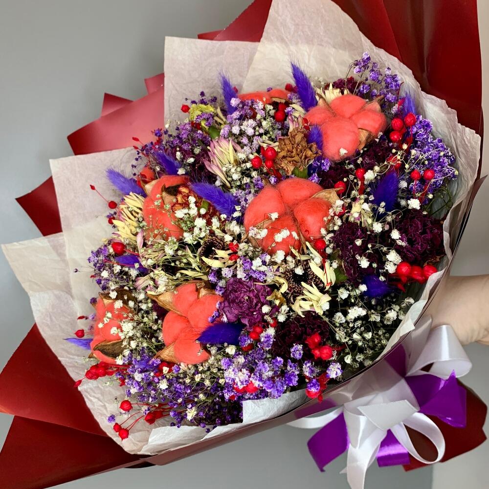 Хлопок – 7 шт.Лента атласная – 3 шт.Тишью – 2 шт.Лагурус (сухоцвет) – 15 шт.Дизайнерская упаковка – 4 шт.гипсофила сухоцвет – 15 шт.цветы сухоцветы – 25 шт.абрус сухоцвет – 30 шт.