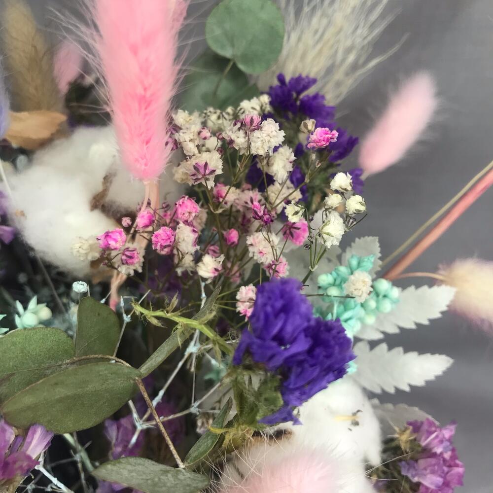 Хлопок натуральный – 7 шт.Лагурус (сухоцвет) – 25 шт.папоротник ветка – 5 шт.Ковыль – 1 шт.Краспедия – 7 шт.статица сухоцвет – 25 шт.сетария сухоцвет – 9 шт.гипсофила сухоцвет – 5 шт.пампасная трава – 2 шт.Кашпо – 1 шт.