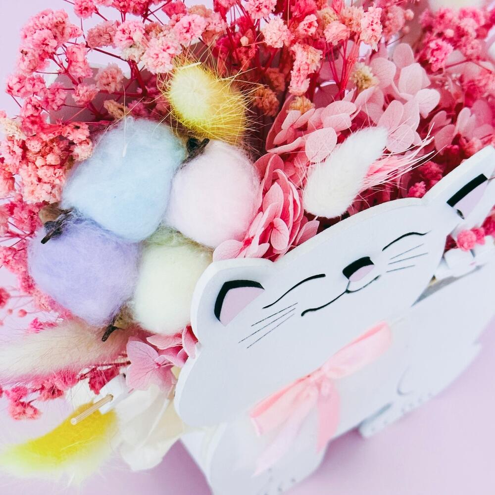 гипсофила стабилизированная розовая – 1 шт.гортензия стабилизированная розовая – 1 шт.лагурус (сухоцвет) белый – 3 шт.лагурус (сухоцвет) сиреневый – 2 шт.лагурус (сухоцвет) желтый – 3 шт.пшеница (сухоцвет) розовый – 2 шт.хлопок (сухоцвет) радужный – 1 шт.декоративные элементы – 4 шт.Открытка – 1 шт.Упаковка дизайнерская – 1 шт.кашпо деревянное котенок – 1 шт.