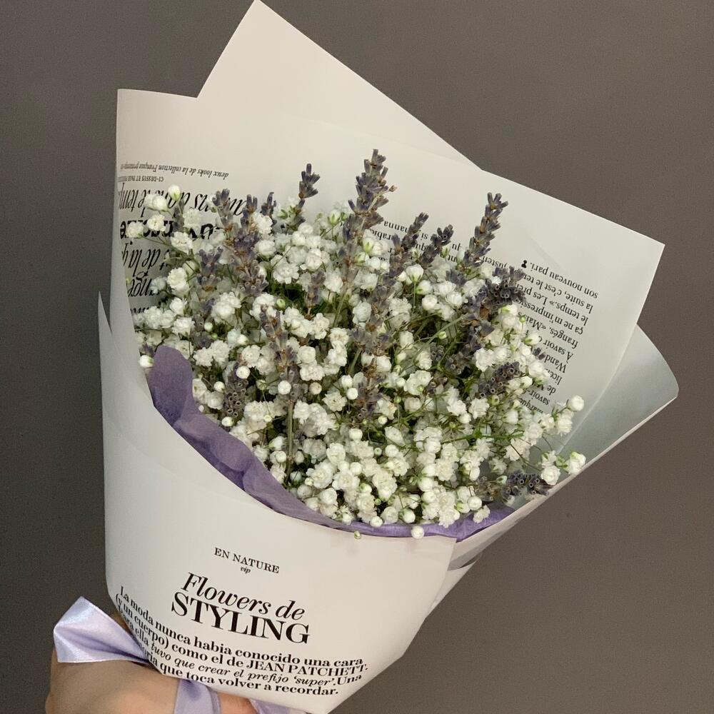 Гипсофила – 15 шт.Лаванда – 36 шт.Дизайнерская упаковка – 1 шт.