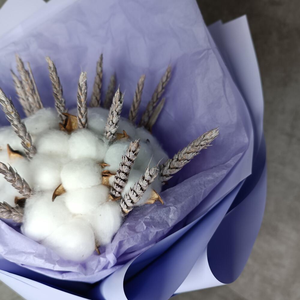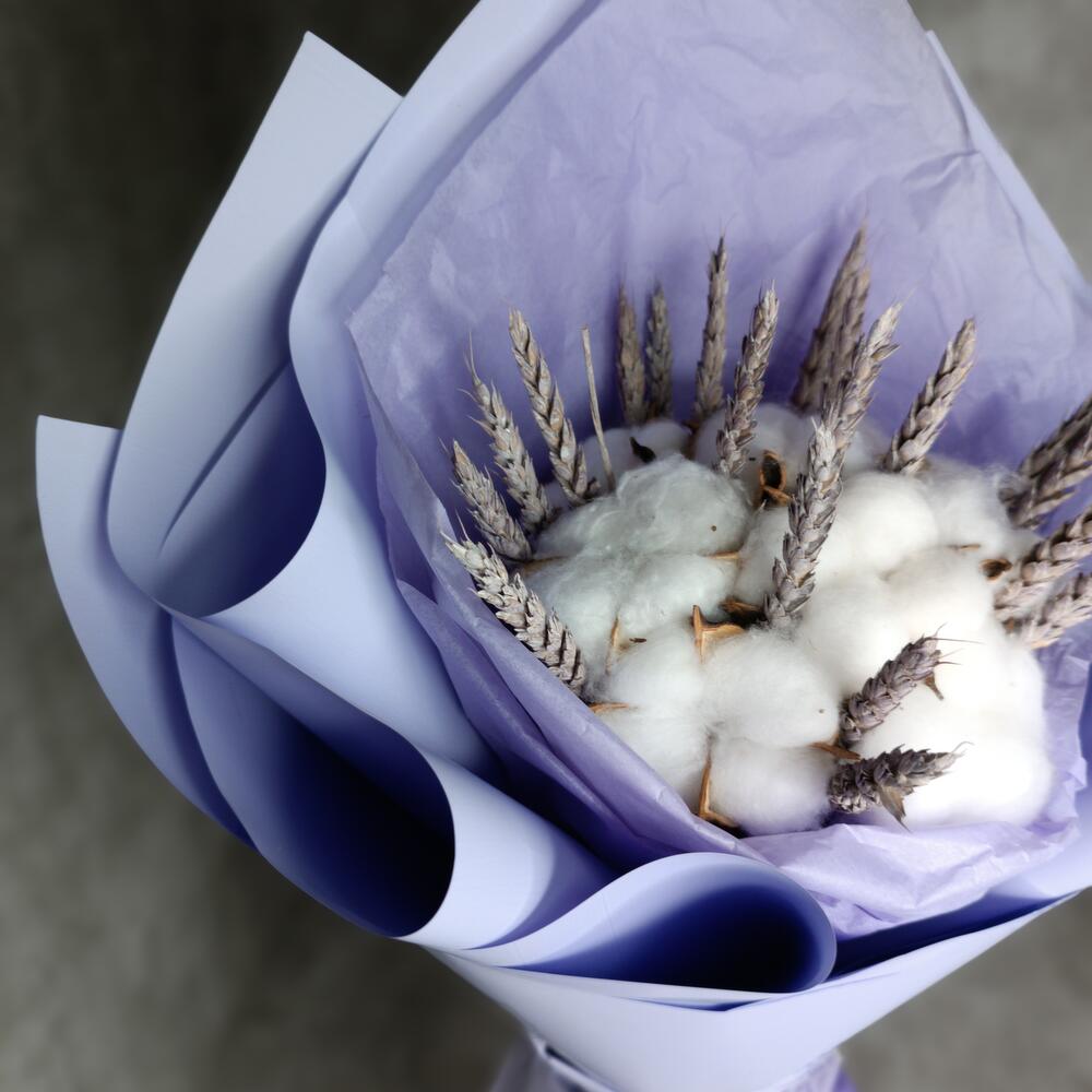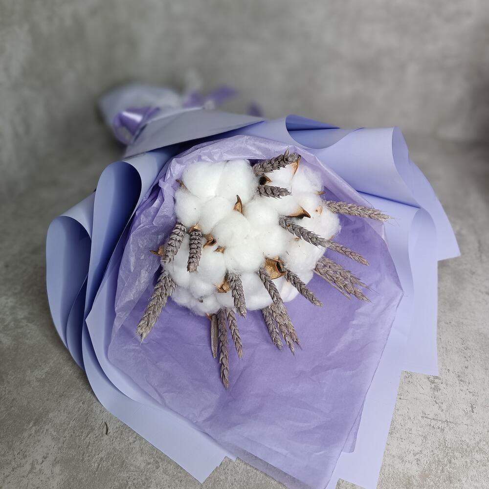 «Лавандовое созвездие» Букет из розы, гвоздики, статица и хлопка