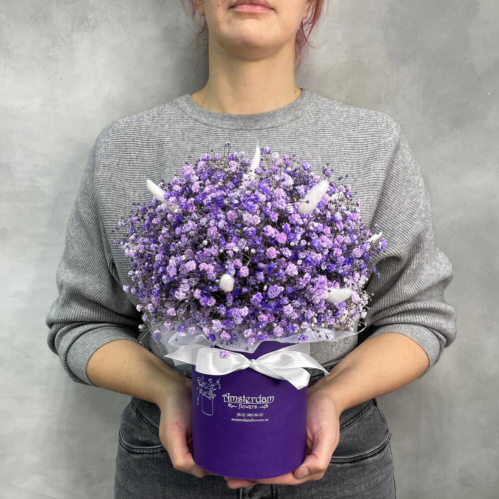 “Сиреневый туман” – композиция из гипсофилы в шляпной коробке