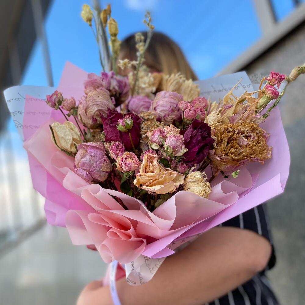 сухоцветы микс – 25 шт.сухоцвет пион – 7 шт.сухоцвет розы – 7 шт.Упаковка – 5 шт.Лента атласная – 2 шт.