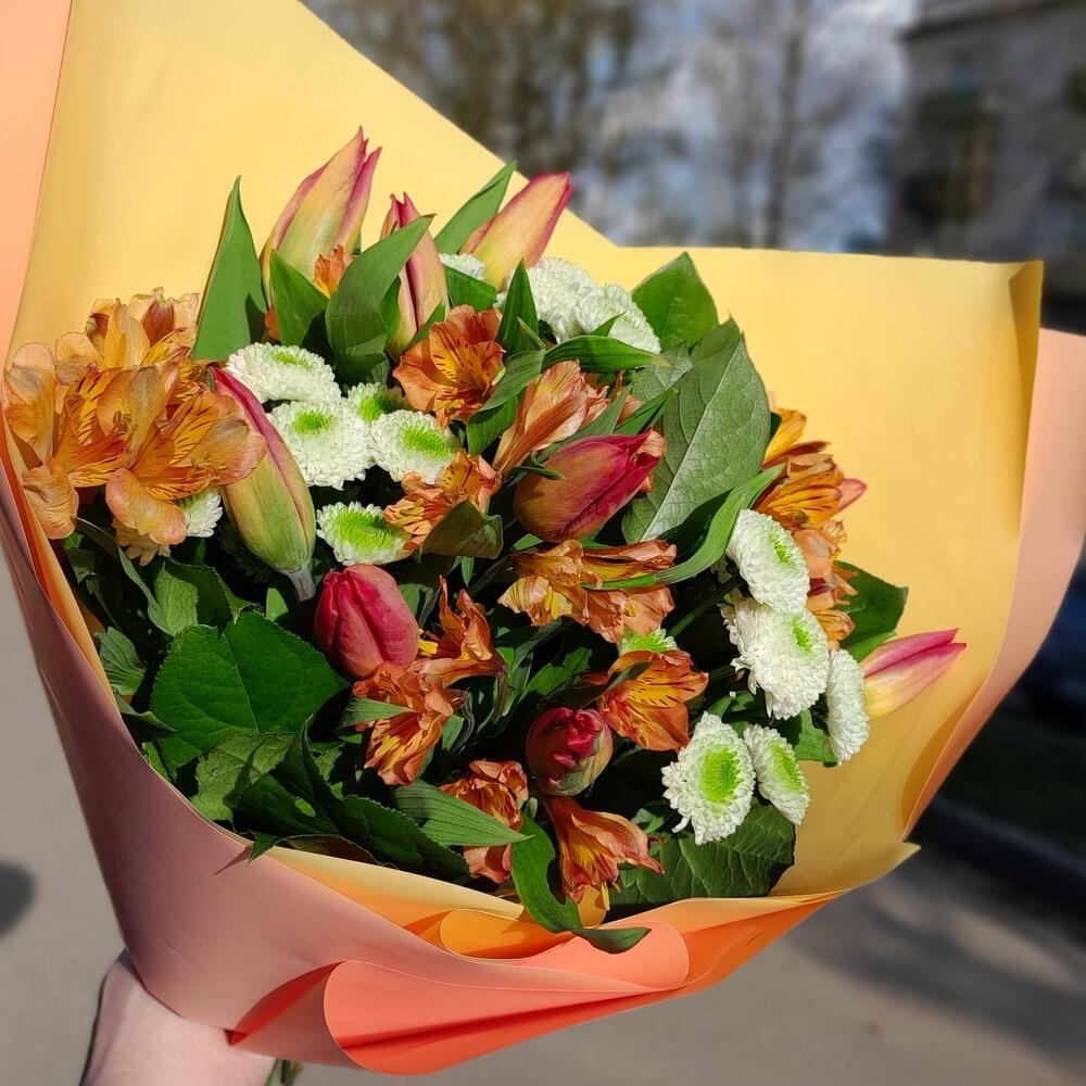 Букет из тюльпанов, альстромерии и сантини